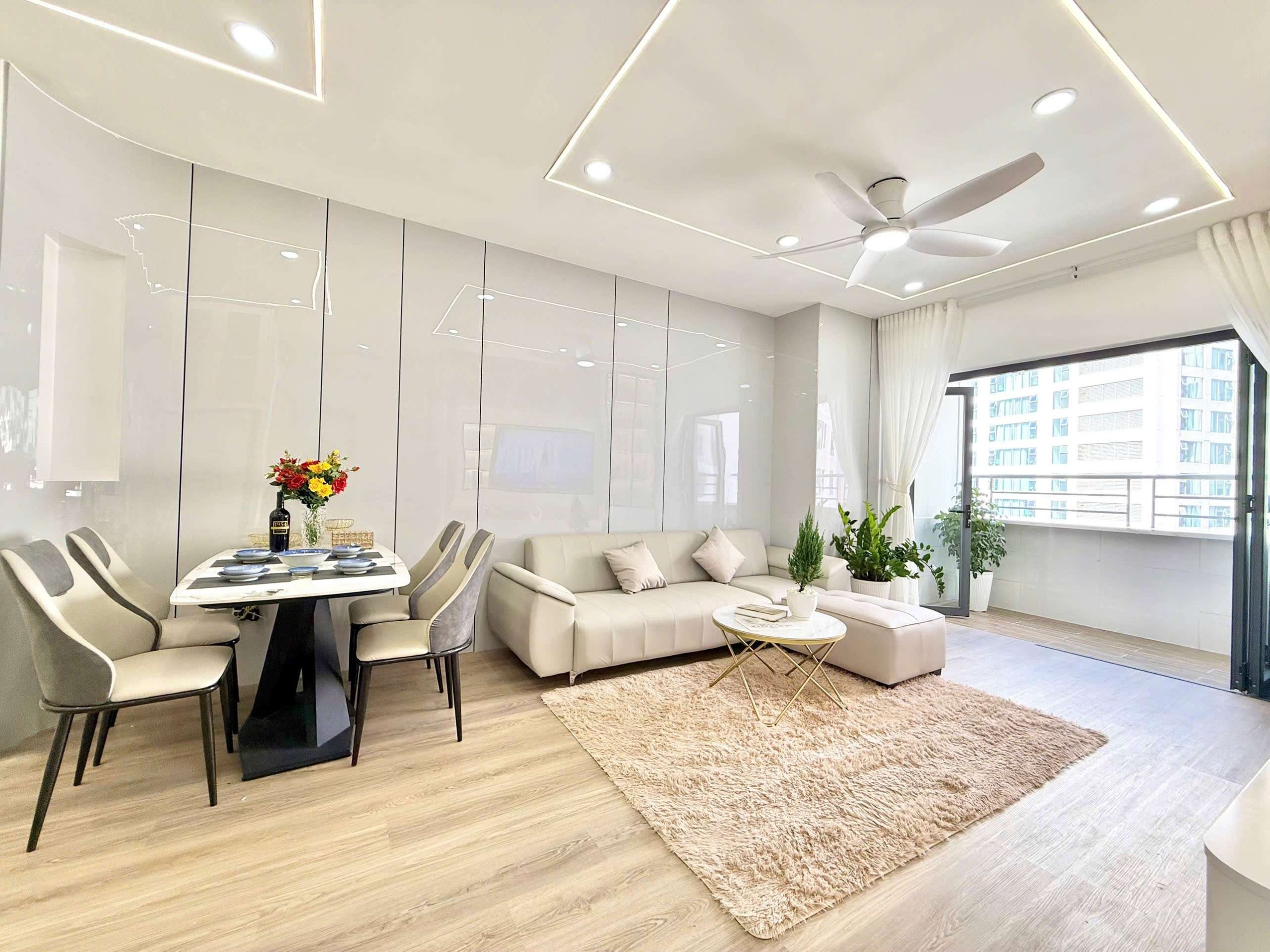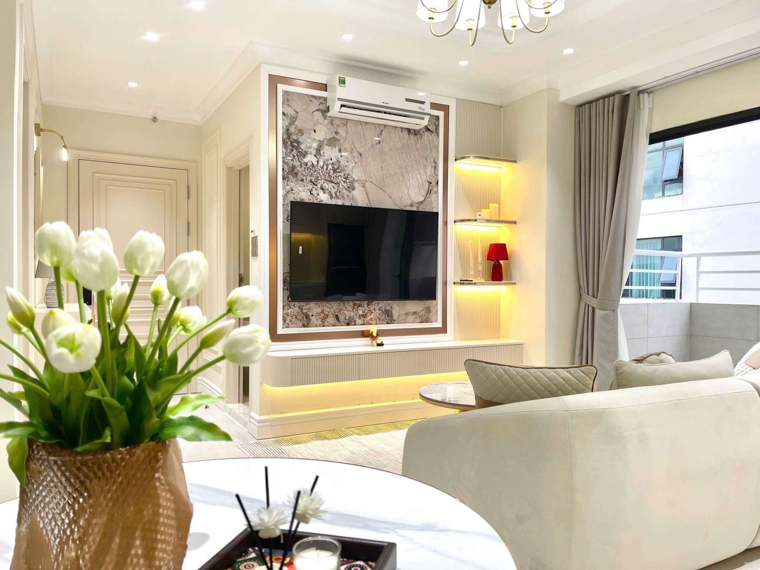 - Phòng khách: Sang trọng với sofa mới, bàn trà tinh tế, tivi, quạt trần,…