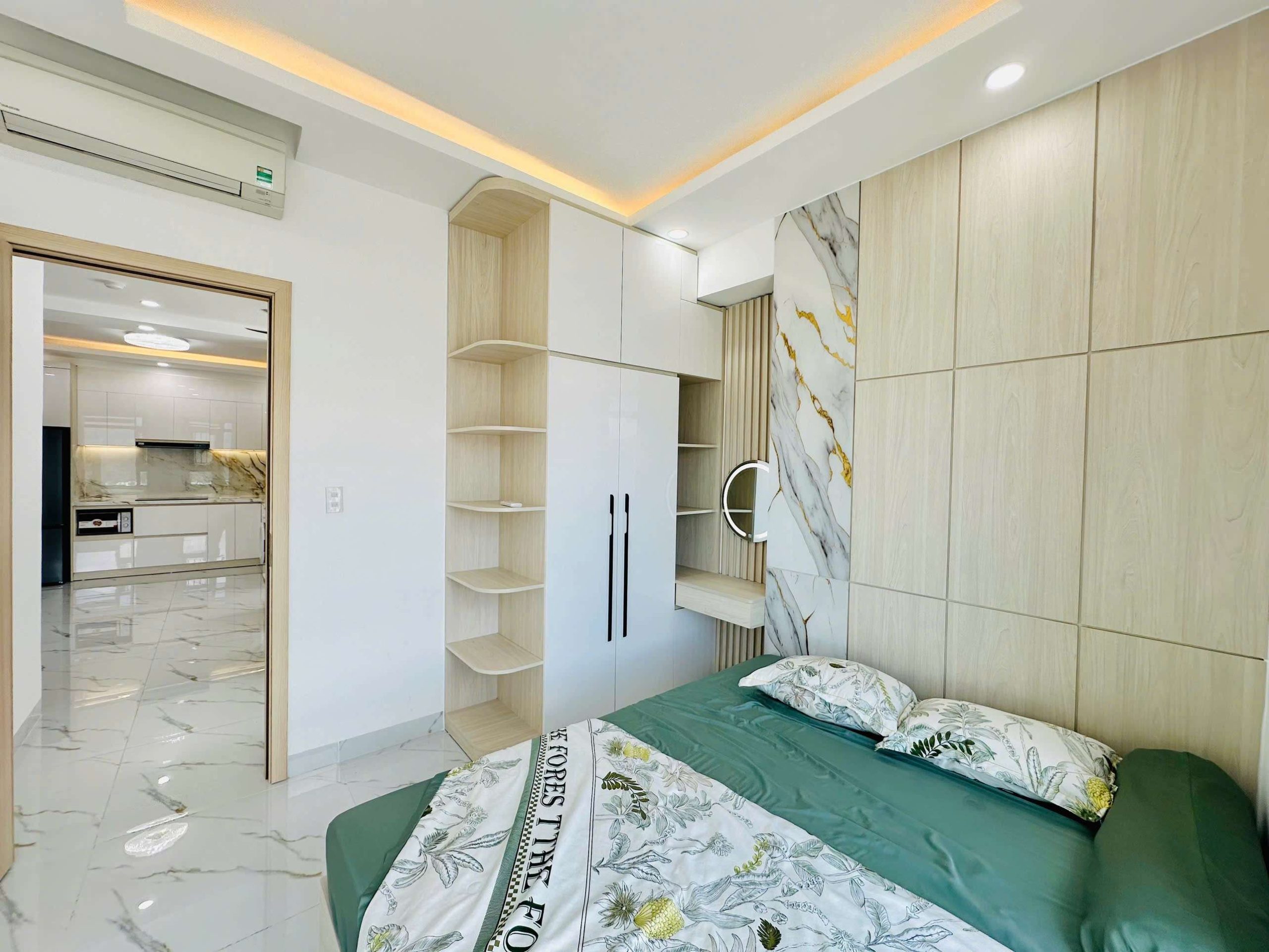 - Phòng ngủ: 2 phòng ngủ rộng rãi với giường king-size, tủ quần áo, máy lạnh