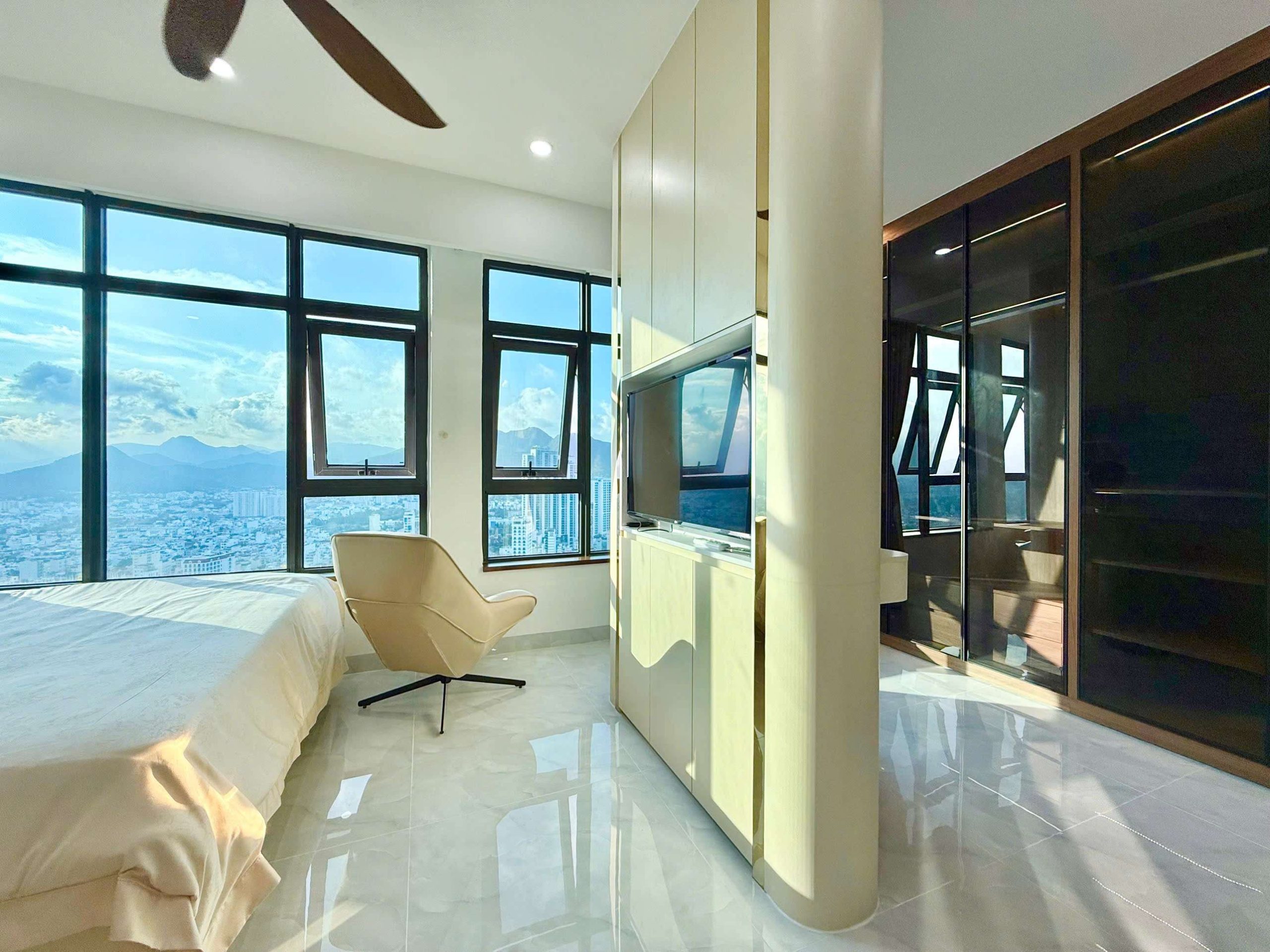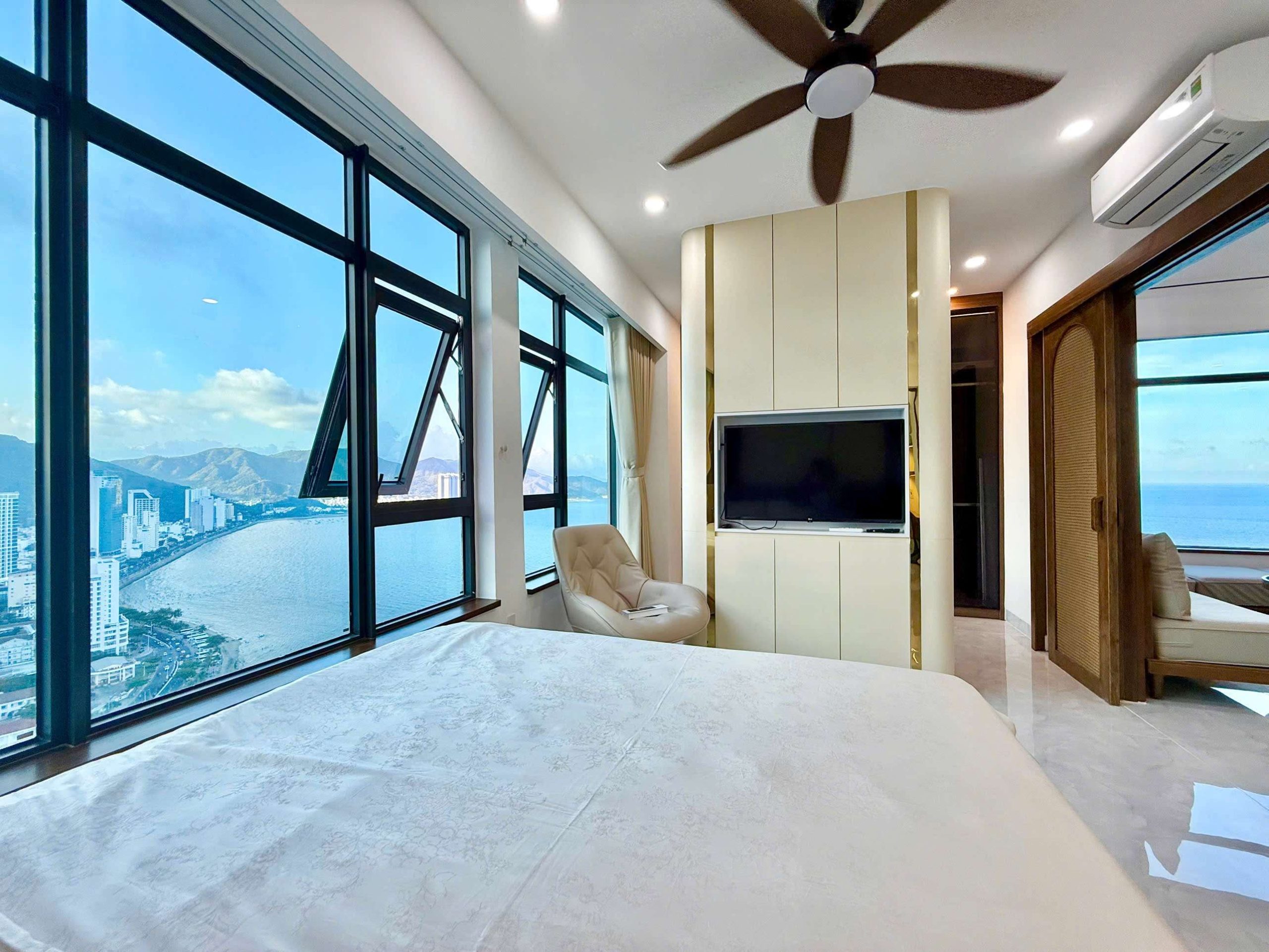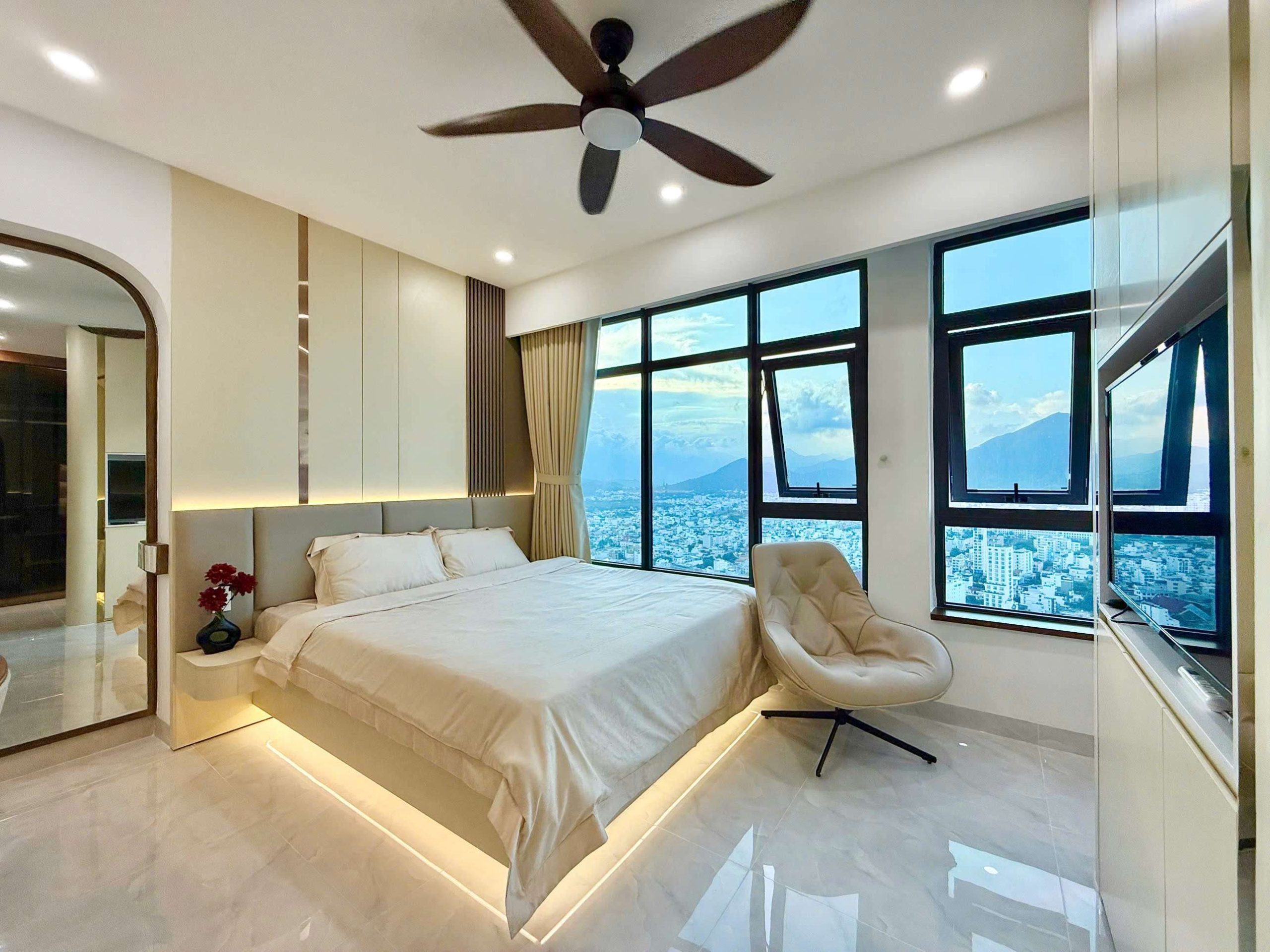 - Phòng ngủ: 1 phòng ngủ cực kỳ rộng rãi với giường king-size, tủ quần áo lớn, và cửa sổ lớn đón sáng. Đặc biệt là tầm view 1-0-2