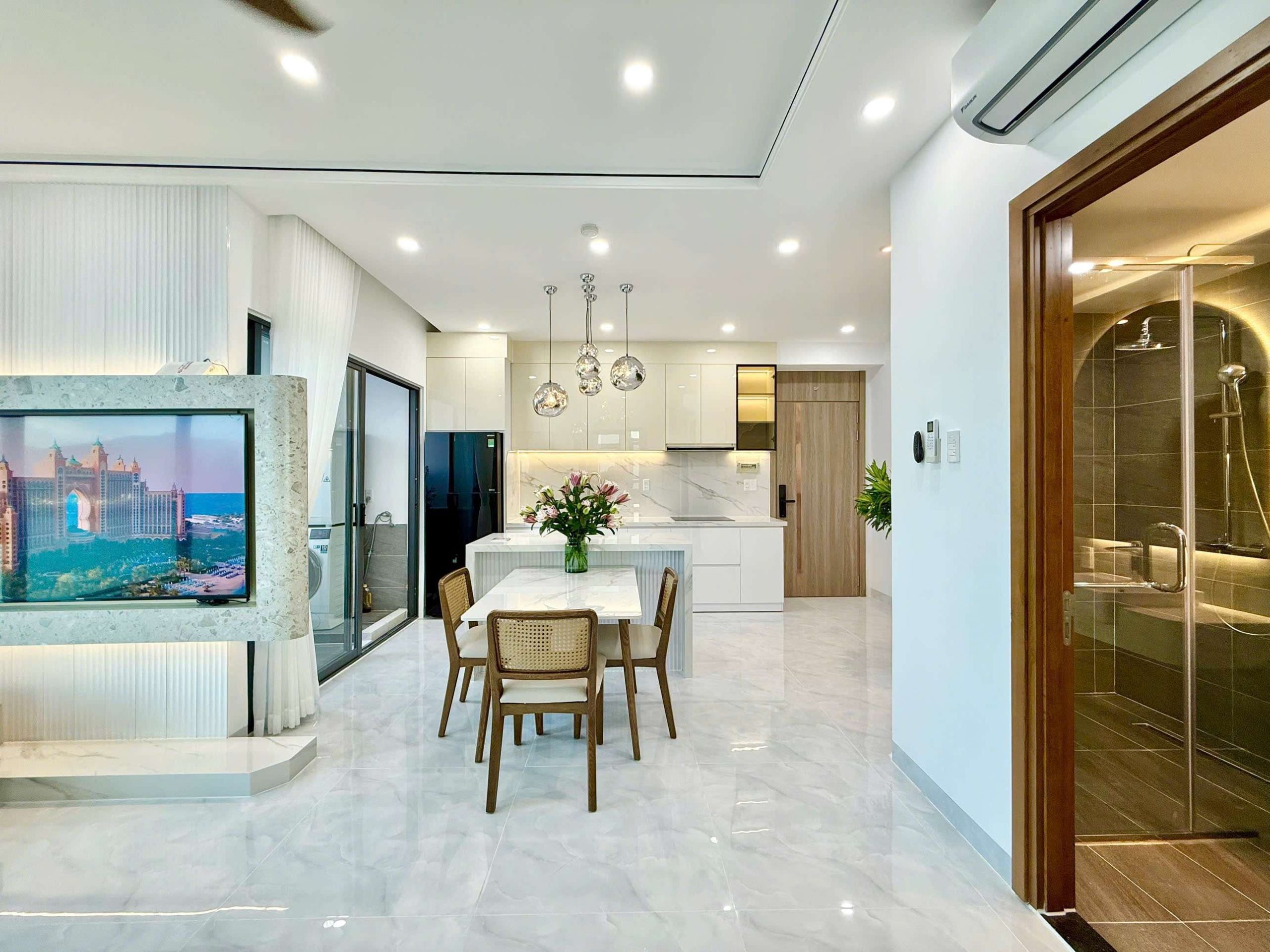 - Phòng khách: Sang trọng với sofa cao cấp, bàn trà tinh tế, tivi, quạt trần, máy lạnh Daikin,….