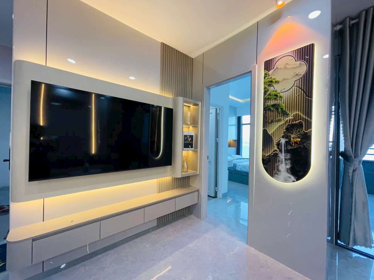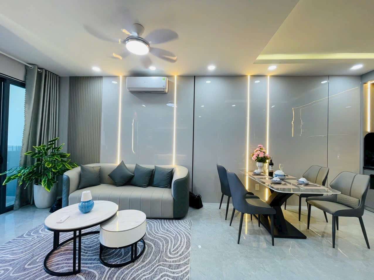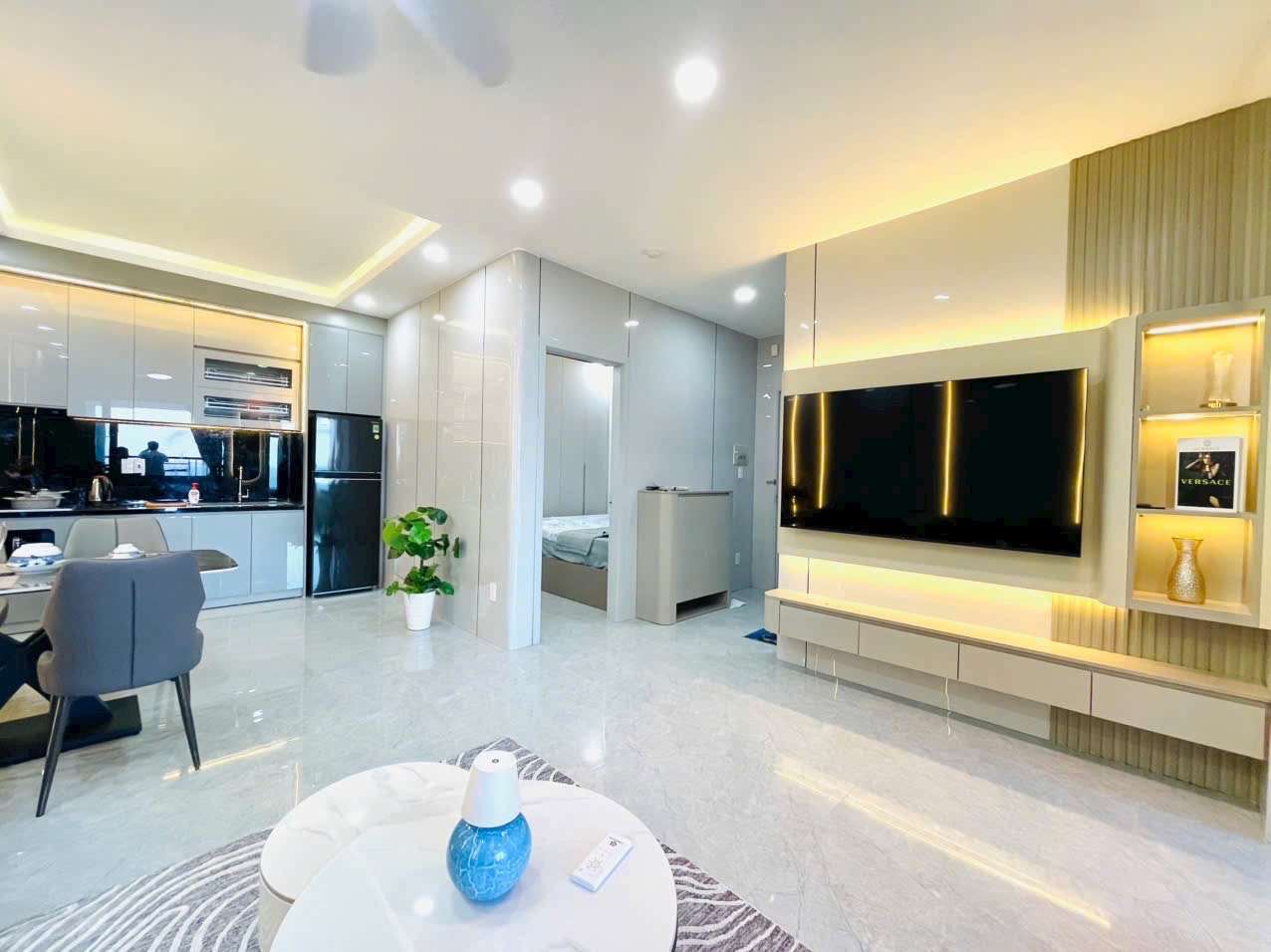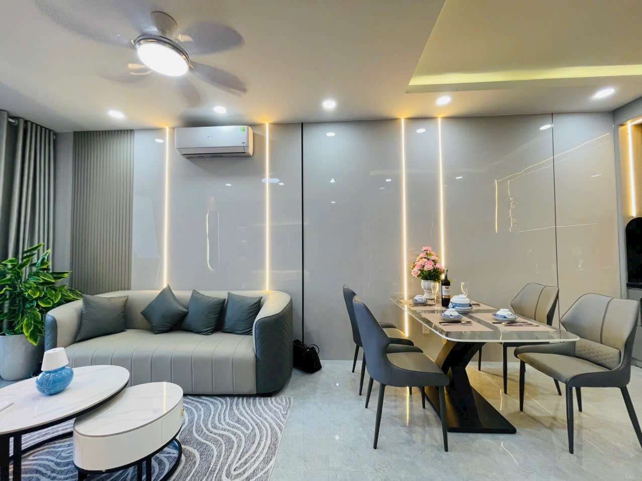 - Phòng khách: Sang trọng với sofa da cao cấp, bàn trà tinh tế, tivi Sony 65inch, quạt trần,…