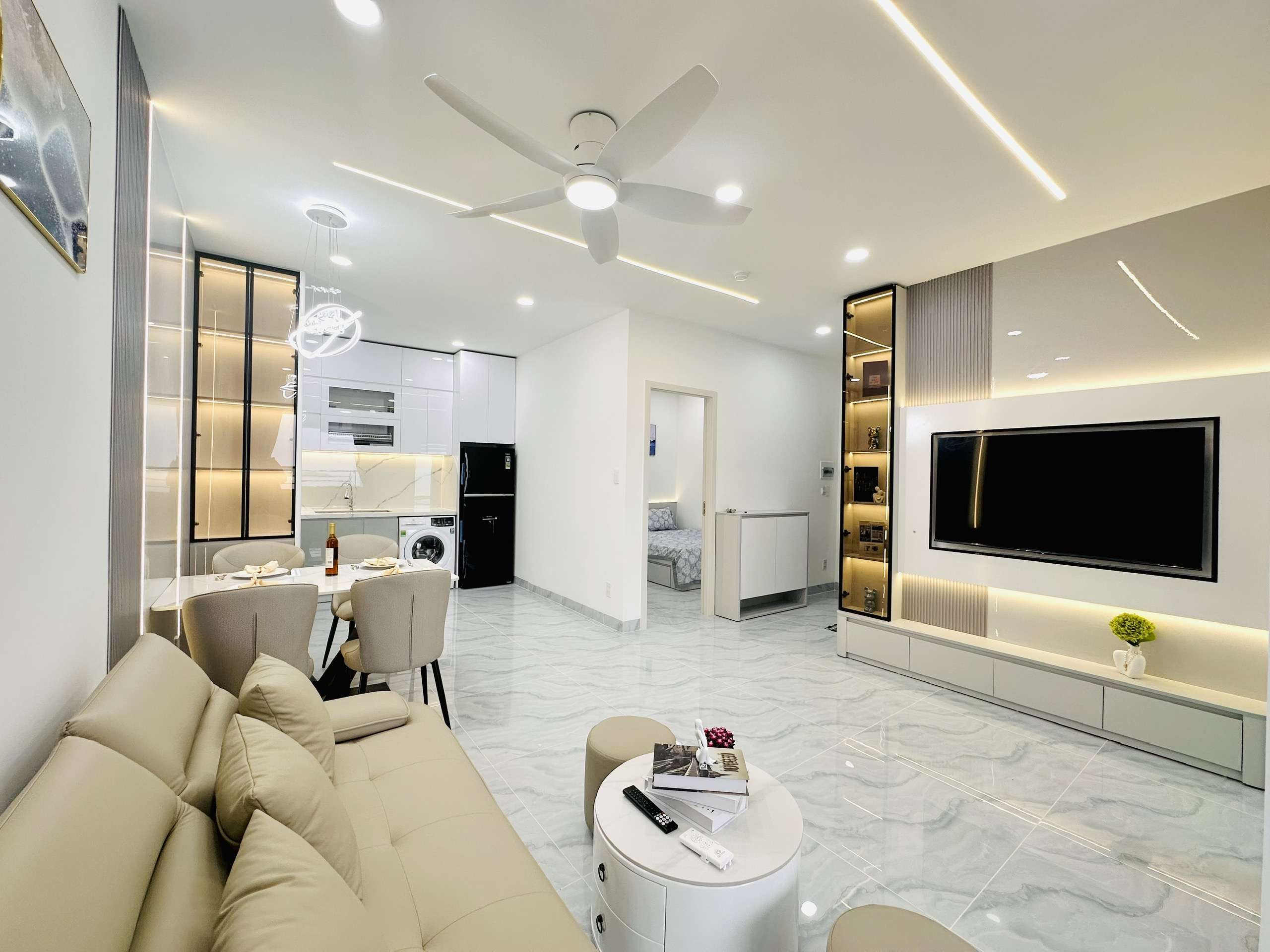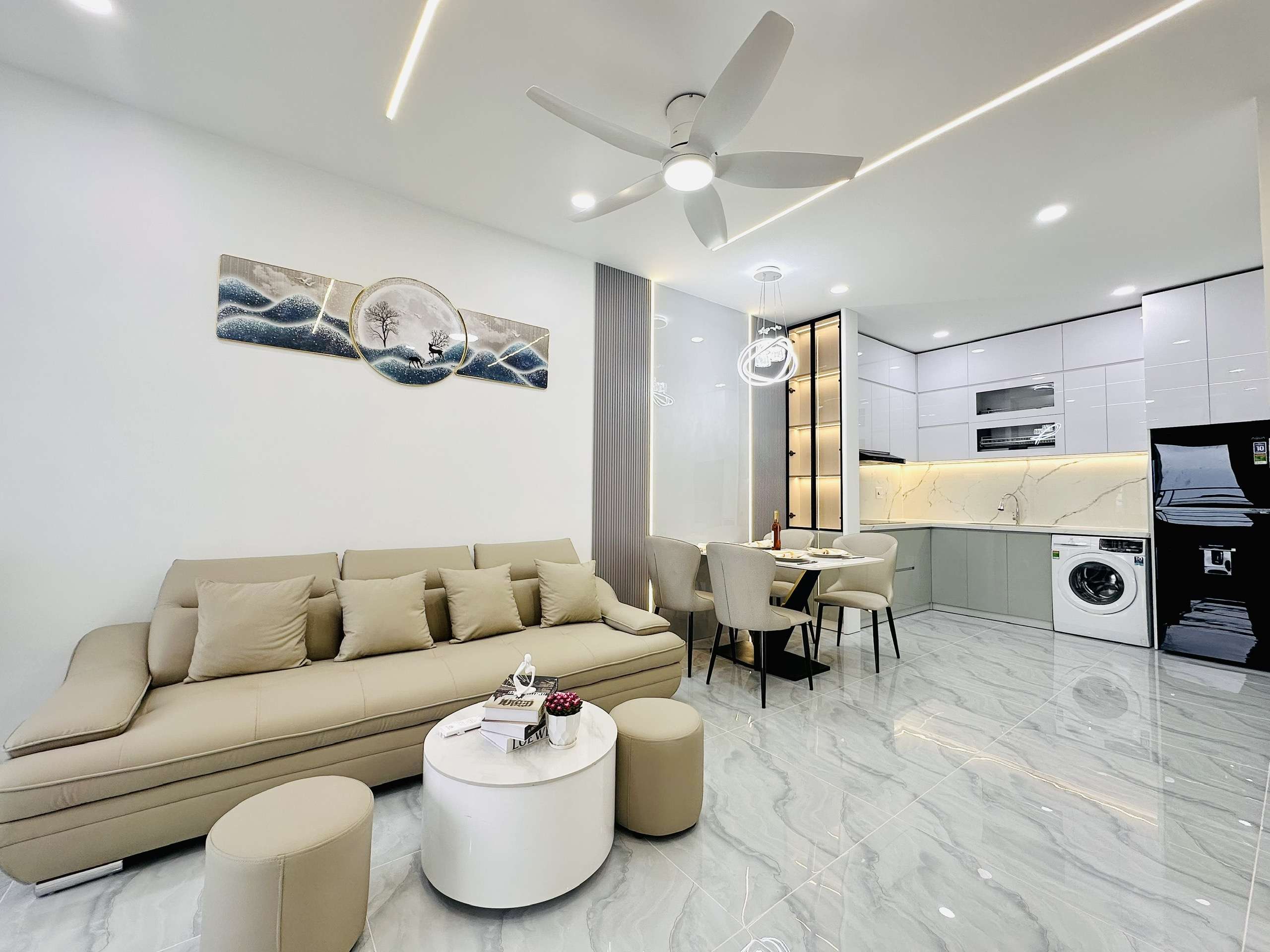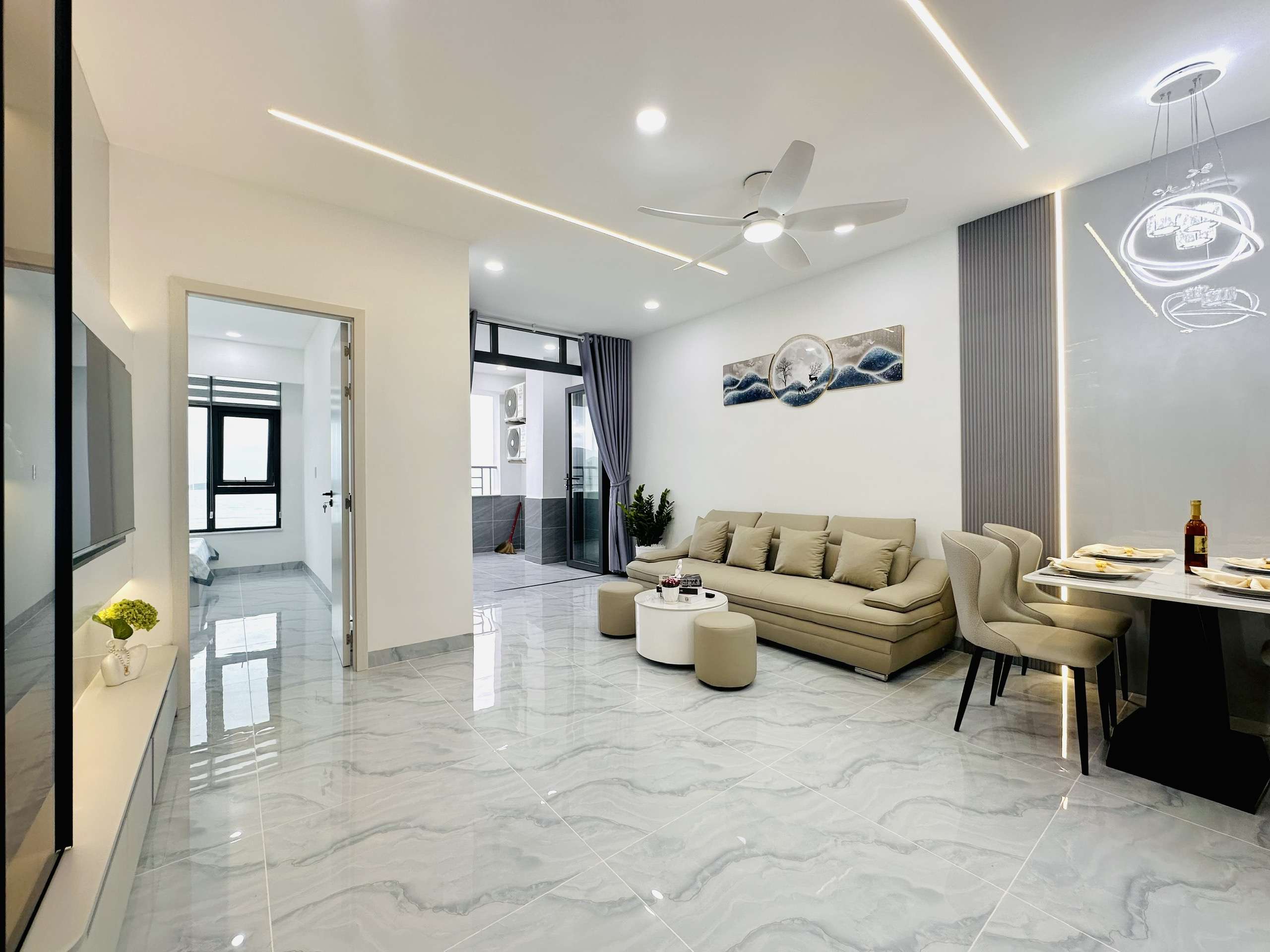 - Phòng khách: Sang trọng với sofa cao cấp, bàn trà tinh tế, tivi, quạt trần
