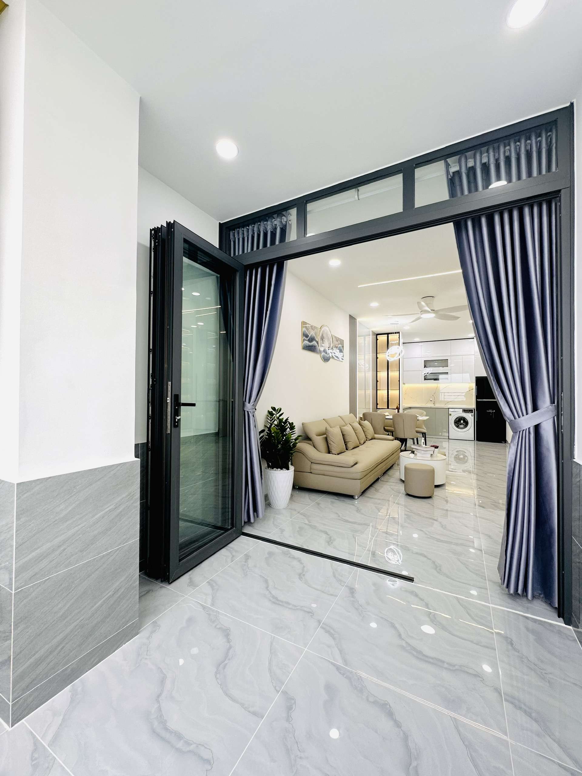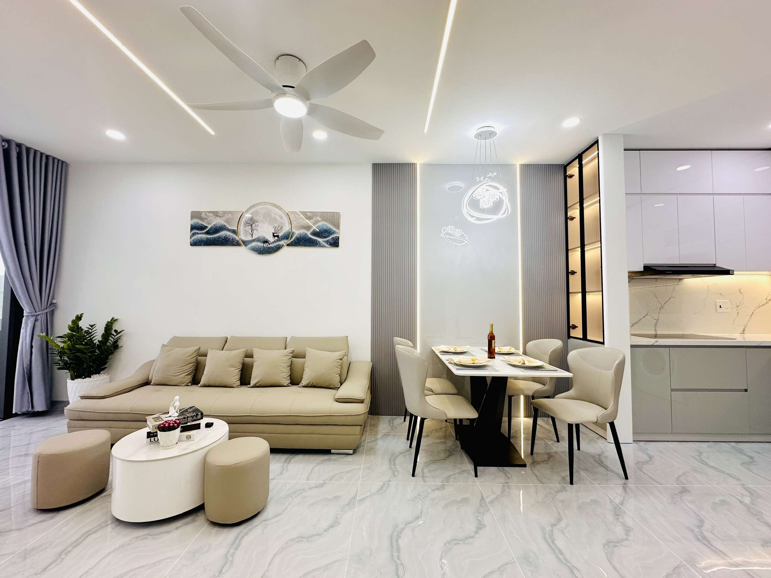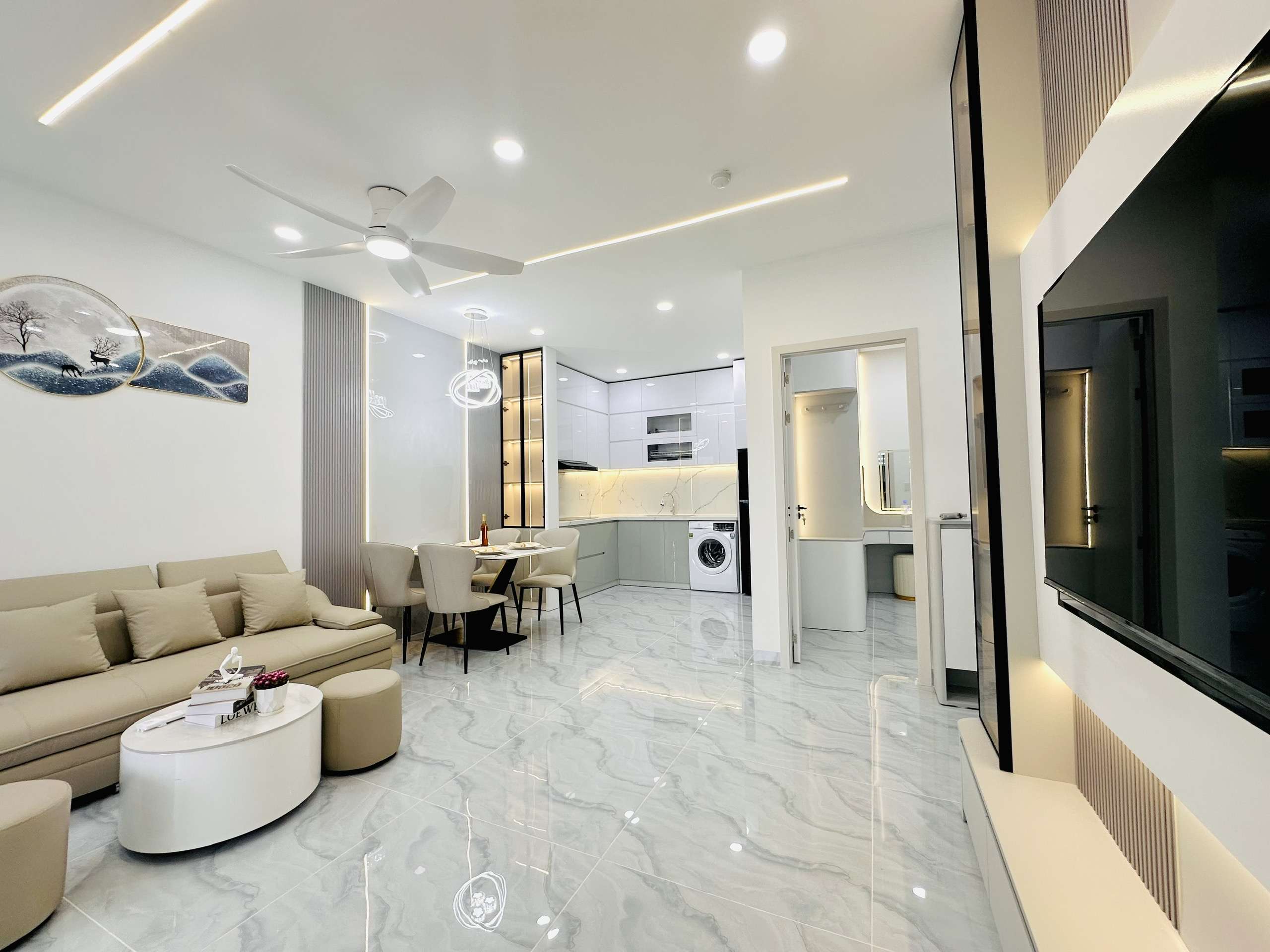 - Phòng khách: Sang trọng với sofa cao cấp, bàn trà tinh tế, tivi, quạt trần