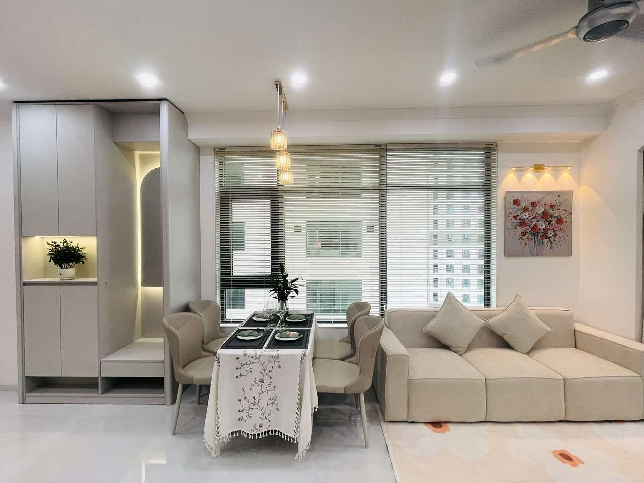 - Phòng khách: Sang trọng với sofa mới, bàn trà tinh tế, tivi, quạt trần,…