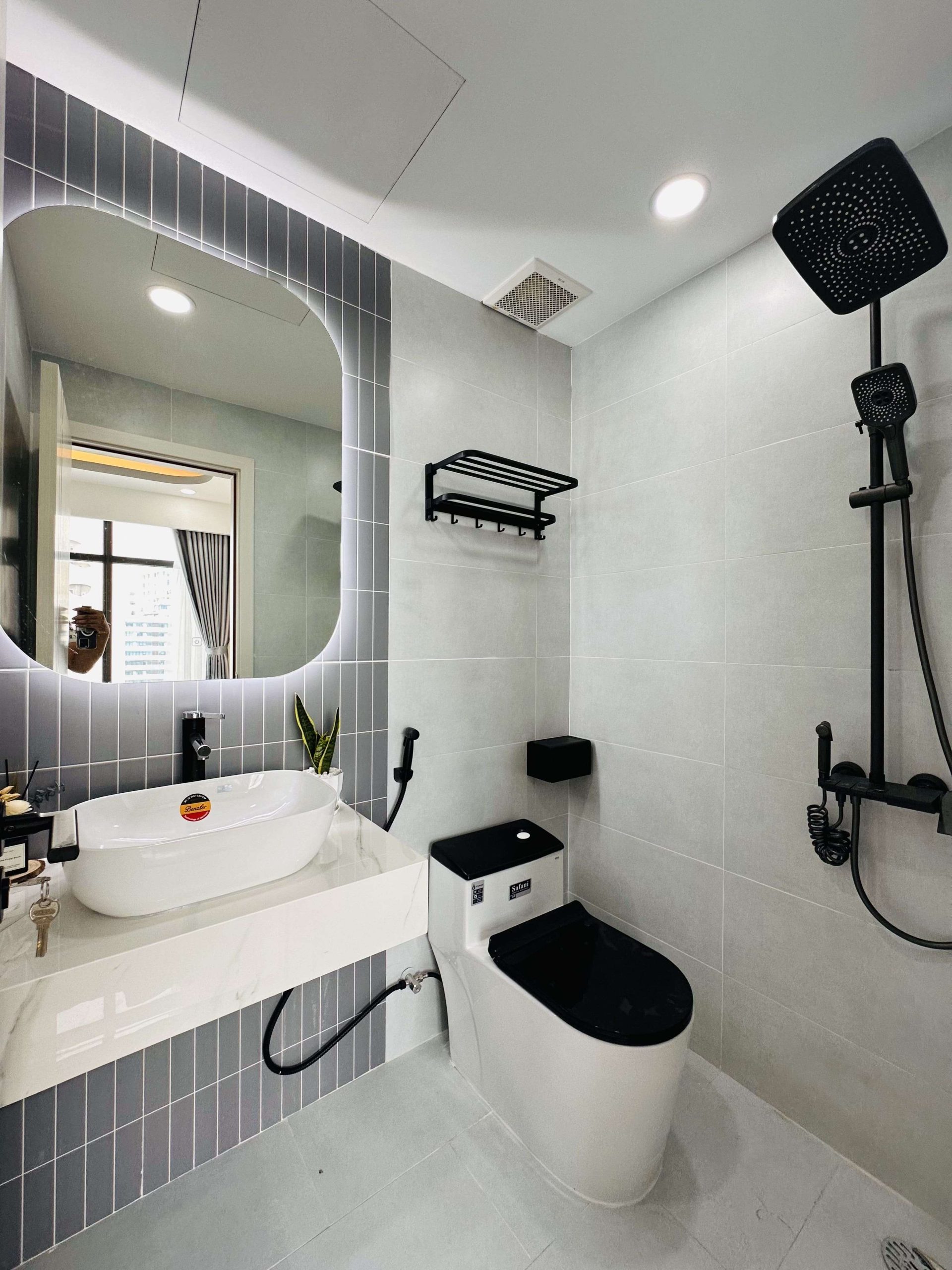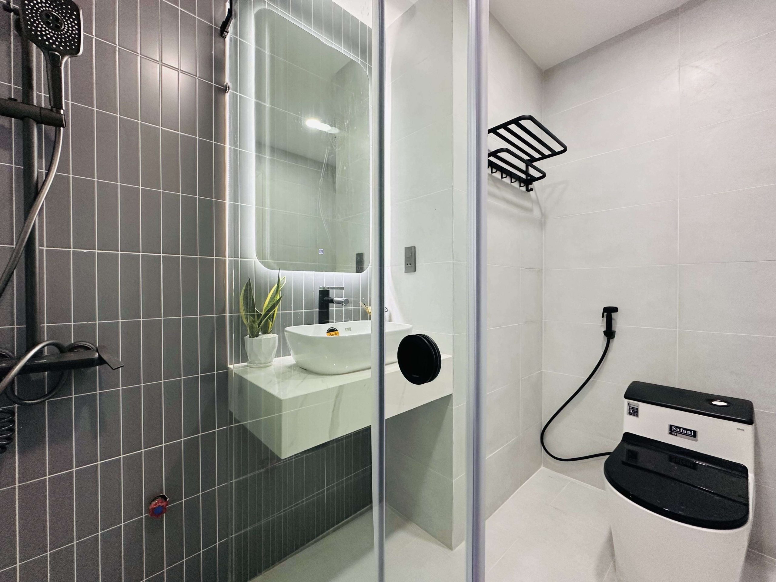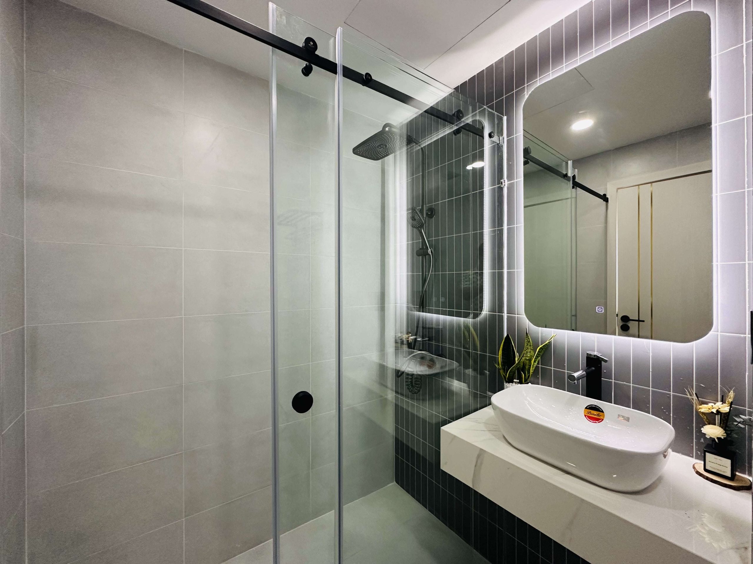 - Nhà vệ sinh: Thiết bị vệ sinh đầy đủ, tiện nghi tối đa. Đặc biệt là đã ốp gạch và làm vách tắm kính đứng