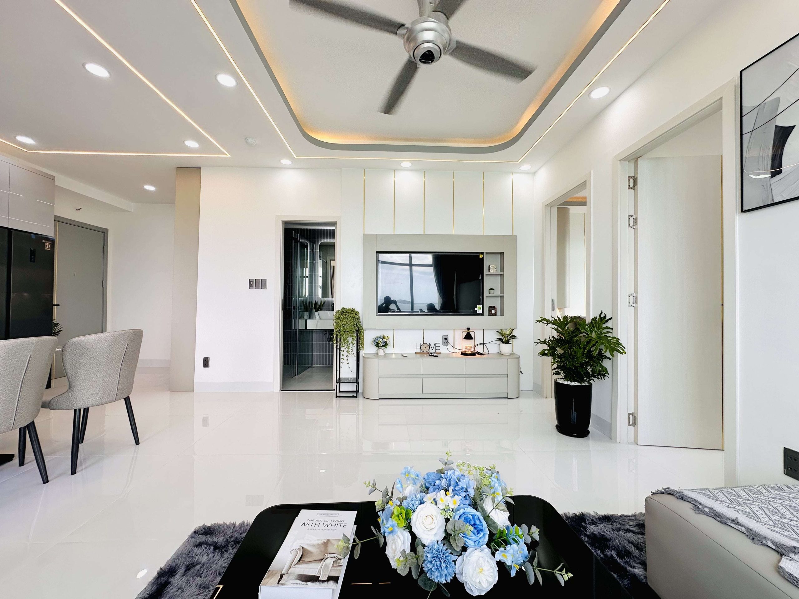 - Phòng khách: Sang trọng với sofa cao cấp, bàn trà tinh tế, tivi, quạt trần