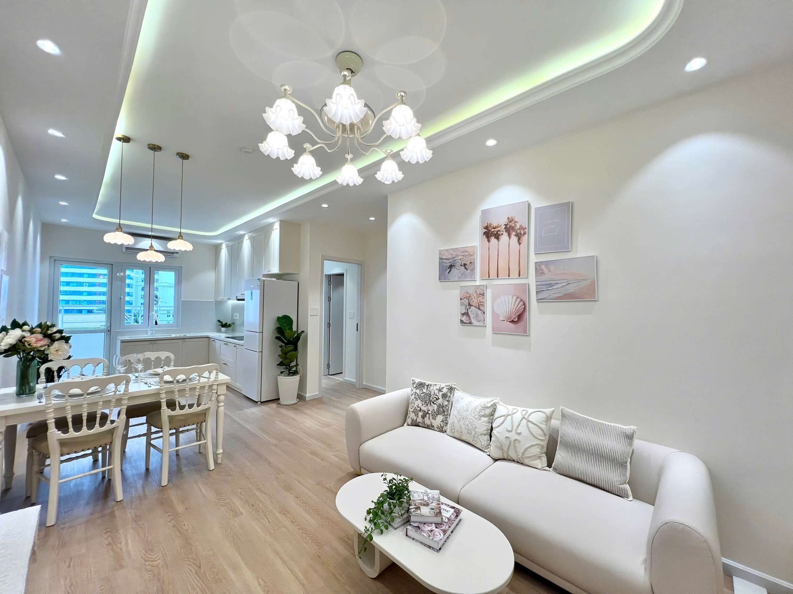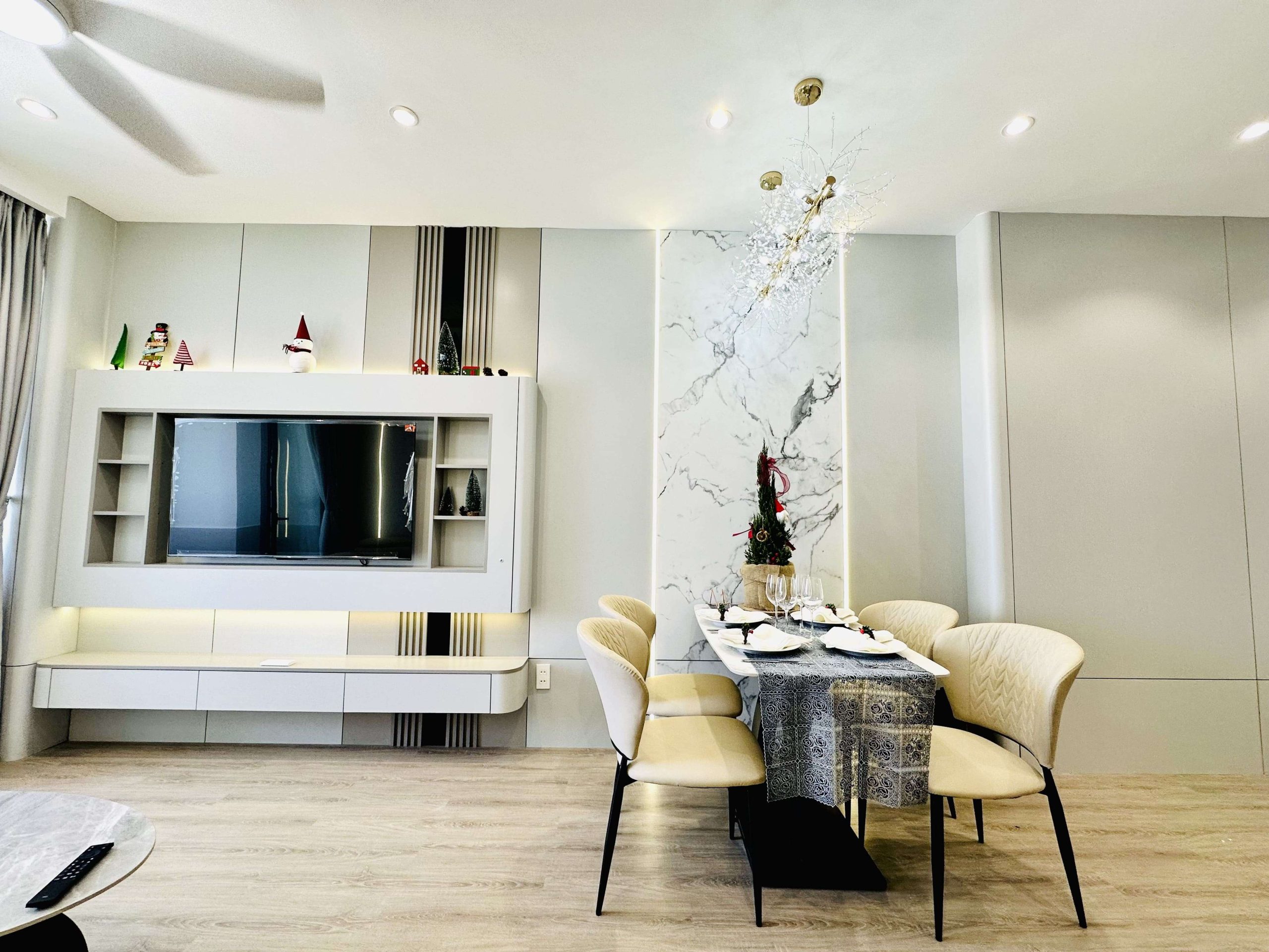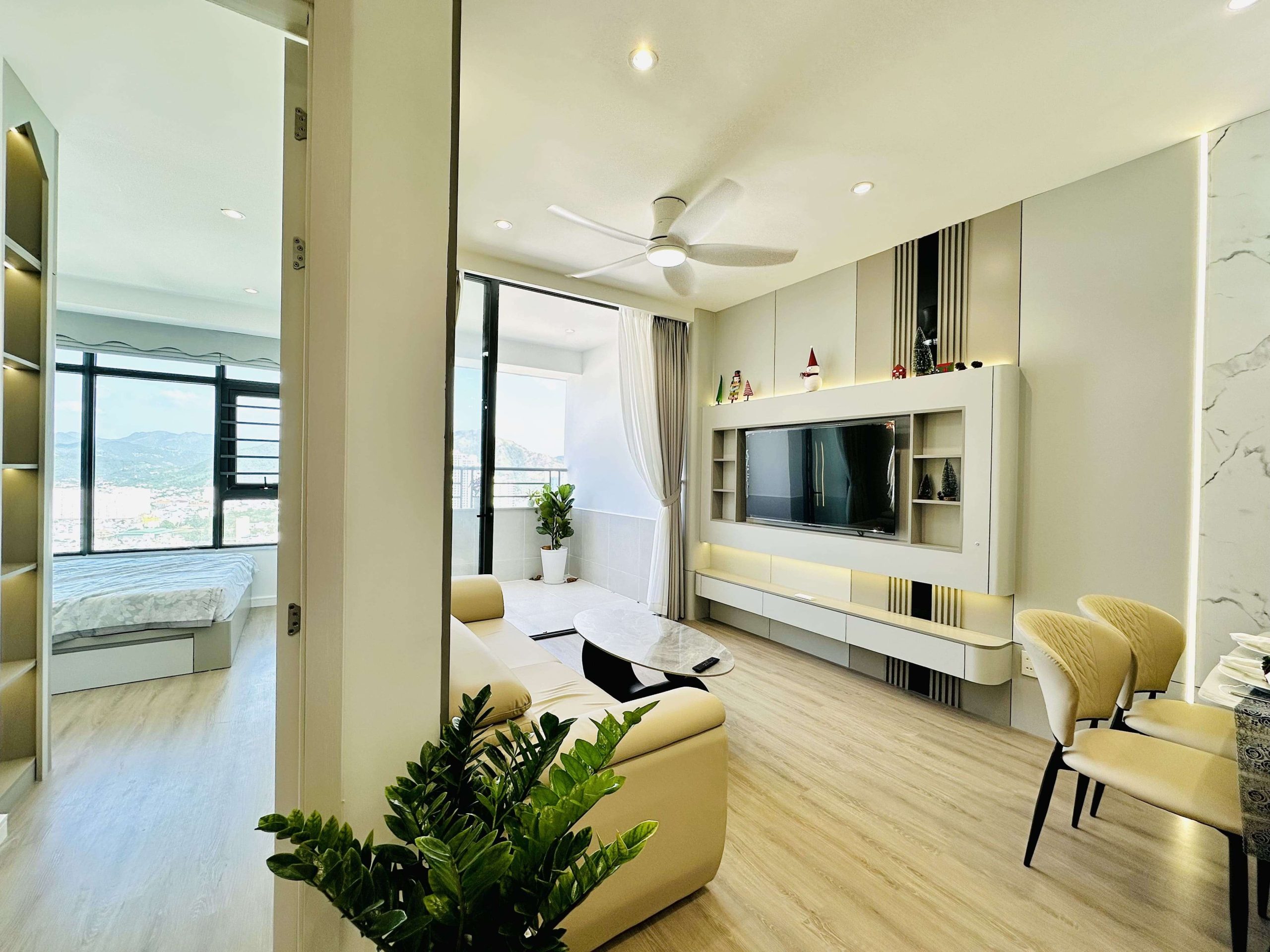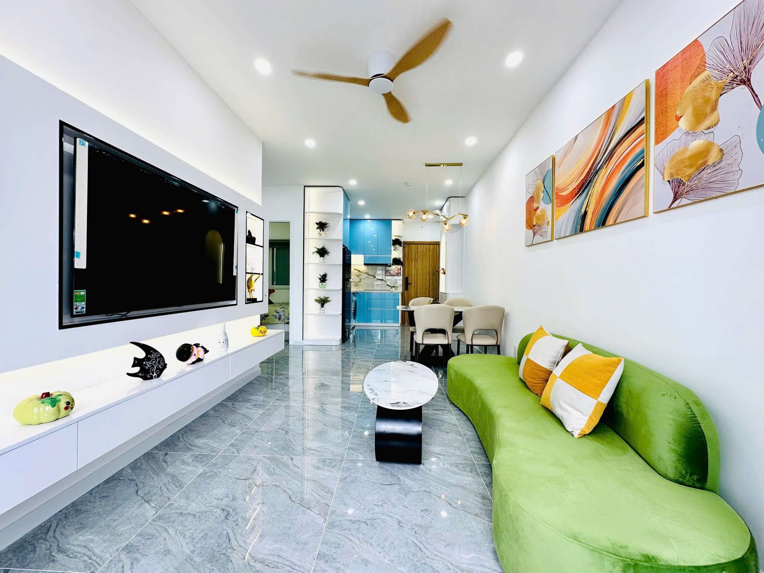 - Phòng khách: Sang trọng với sofa cao cấp, bàn trà tinh tế, tivi, quạt trần
