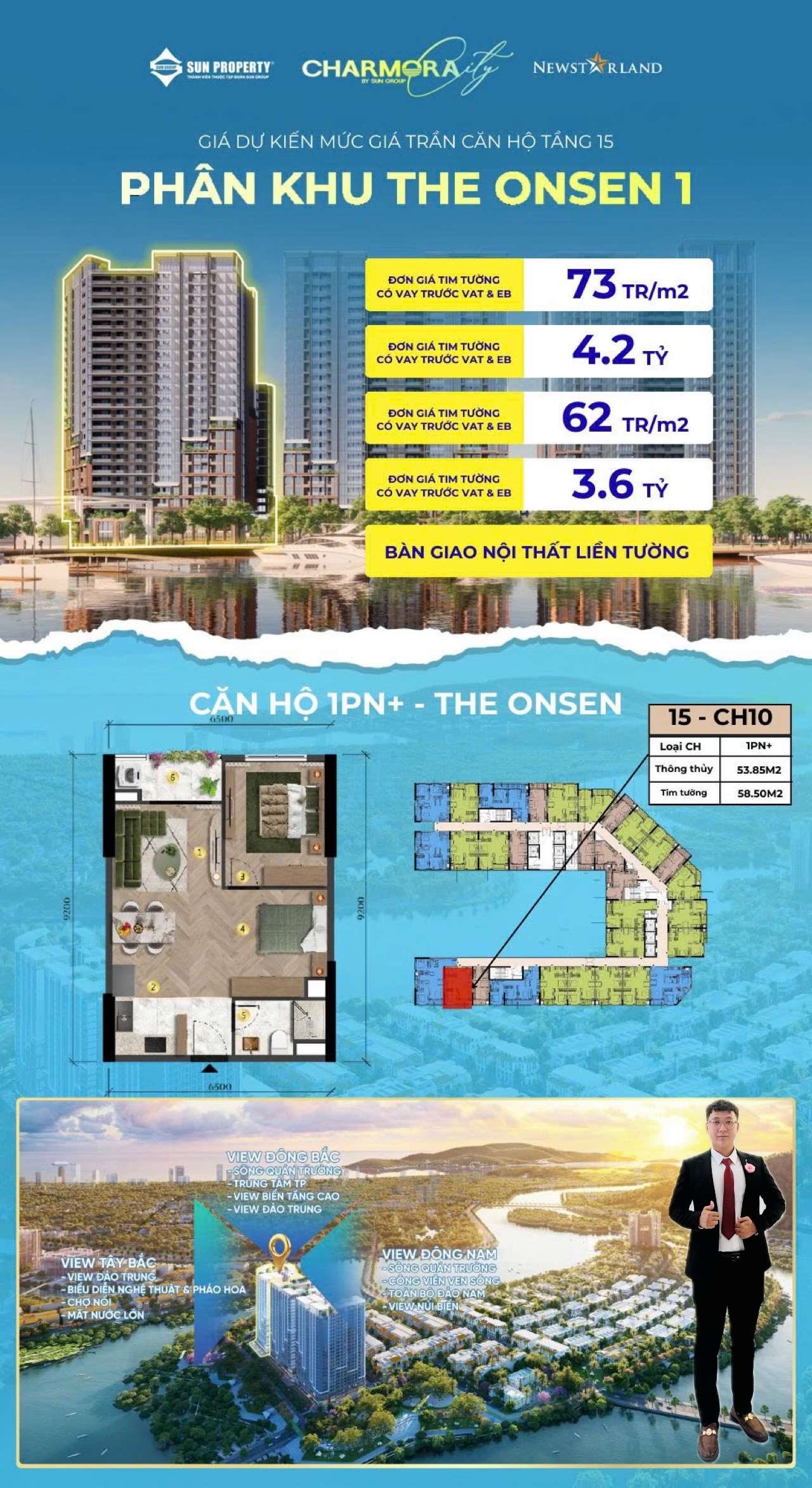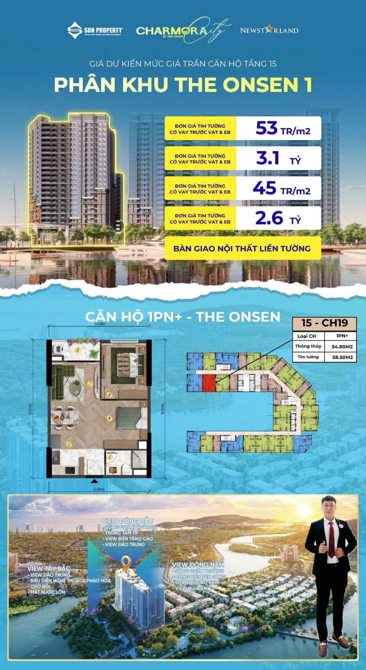 Charmora City là đại đô thị ven sông – kề biển quy mô hơn 220 ha tại phía Nam Nha Trang, được Sun Group quy hoạch bài bản với 3 “bán đảo” chức năng, hệ sinh thái tiện ích du lịch – thương mại – vui chơi giải trí đồng bộ. Trong đó, The Onsen 1 là một trong những tòa căn hộ đầu tiên được giới thiệu ra thị trường.